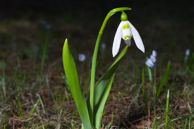 Próbuję makrofotografii z lampami błyskowymi - ostatni przebiśnieg, który wyrósł w tym roku w naszym ogrodzie, a w tle rozrastające się puszkiniowisko.